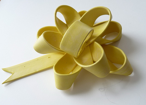 the above ceramic present bows [she's also done versions in birch and red oak which are LOVELY] are just so simply wonderful. funny. bright. colorful. nostalgic. and more permanent than their real life counterparts.
